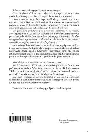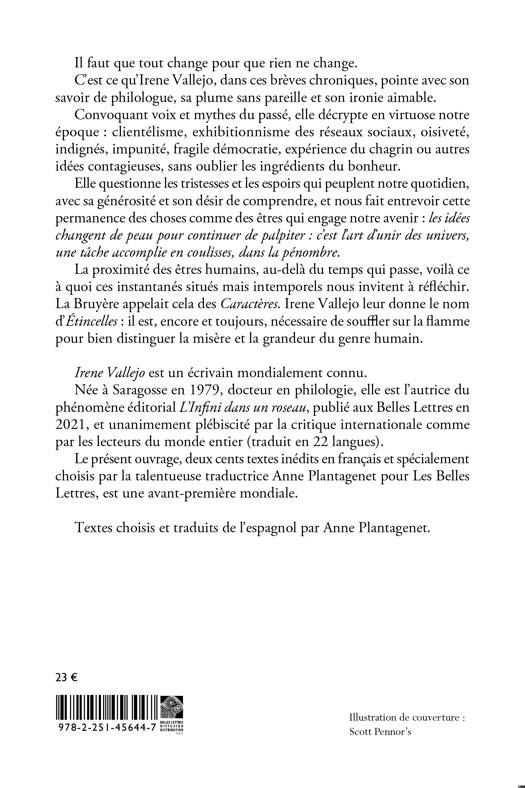Il faut que tout change pour que rien ne change. C'est ce qu'Irene Vallejo, dans ces breves chroniques, pointe avec son savoir de philologue, sa plume sans pareille et son ironie aimable. Convoquant voix et mythes du passe, elle decrypte en virtuose notre epoque: clientelisme, exhibitionnisme des reseaux sociaux, oisivete, indignes, impunite, fragile democratie, experience du chagrin ou autres idees contagieuses, sans oublier les ingredients du bonheur. Elle questionne les tristesses et les espoirs qui peuplent notre quotidien, avec sa generosite et son desir de comprendre, et nous fait entrevoir cette permanence des choses comme des etres qui engage notre avenir: les idees changent de peau pour continuer de palpiter: c'est l'art d'unir des univers, une tache accomplie en coulisses, dans la penombre. La proximite des etres humains, au-dela du temps qui passe, voila ce a quoi ces instantanes situes mais intemporels nous invitent a reflechir. La Bruyere appelait cela des Caracteres. Irene Vallejo leur donne le nom d'Etincelles: il est, encore et toujours, necessaire de souffler sur la flamme pour bien distinguer la misere et la grandeur du genre humain.