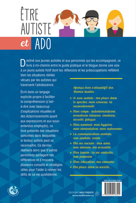 Destiné aux jeunes autistes et aux personnes qui les accompagnent, ce livre à mi-chemin entre le guide pratique et le blogue donne une voix à un jeune autiste fictif dont les réflexions et les préoccupations reflètent bien les situations réelles vécues par les autistes qui traversent l’adolescence. Écrit dans un langage explicite propre à faciliter la compréhension (c’est-à-dire avec beaucoup d’explications visuelles et des éclaircissements quant aux expressions et aux sous-entendus employés), ce livre présente des situations concrètes dans lesquelles le lecteur autiste peut se reconnaître. Ce dernier réalisera alors que d’autres personnes partagent ses différences et il trouvera plusieurs conseils et stratégies utiles pour l’aider à relever les défis de sa vie quotidienne.