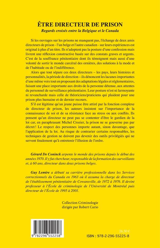 Deux directeurs de prison, l'un belge et l'autre canadien, livrent ici une réflexion constructive sur le monde carcéral. Ils dénoncent des lacunes et proposent des adaptations légales et réglementaires faisant une large place aux droits de la personne détenue et aux attentes du personnel de surveillance. Un directeur de prison ne doit pas se contenter d'être le gardien de la loi : le respect des personnes importe autant, sinon davantage.