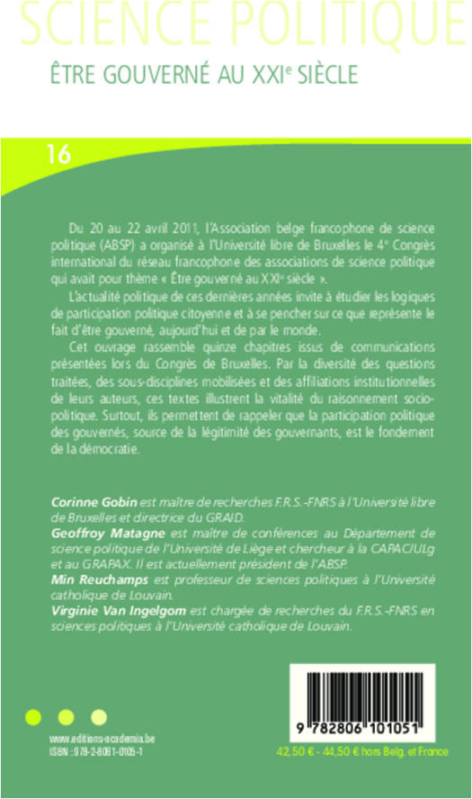 Cet ouvrage rassemble quinze chapitres issus du 4e Congrès du réseau francophone des associations de science politique (« Être gouverné au XXIe siècle », Bruxelles, avril 2011). Par la diversité des questions traitées, des sous-disciplines et des affiliations de leurs auteurs, ils illustrent la vitalité du raisonnement socio-politique. Surtout, ils permettent de rappeler que la participation politique des gouvernés, source de la légitimité des gouvernants, est le fondement de la démocratie.