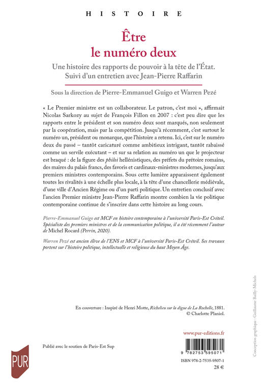 « Le Premier ministre est un collaborateur. Le patron, c’est moi », affirmait Nicolas Sarkozy au sujet de François Fillon en 2007 : c’est peu dire que les rapports entre le président et son numéro deux sont marqués, non seulement par la coopération, mais par la compétition. Jusqu’à récemment, c’est surtout le numéro un, président ou monarque, que l’histoire a retenu. Ici, c’est sur le numéro deux du passé – tantôt caricaturé comme ambitieux intrigant, tantôt rabaissé comme un servile exécutant – et sur sa relation au numéro un que le projecteur est braqué : de la figure des philoi hellénistiques, des préfets du prétoire romains, des maires du palais francs, des favoris et cardinaux-ministres modernes, jusqu’aux premiers ministres contemporains. Sous cette lumière apparaissent également toutes les rivalités à une échelle plus locale, à la tête d’une chancellerie médiévale, d’une ville d’Ancien Régime ou d’un parti politique. Un entretien conclusif avec l’ancien Premier ministre Jean-Pierre Raffarin montre combien la vie politique contemporaine continue de s’inscrire dans cette histoire au long cours.