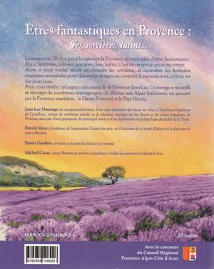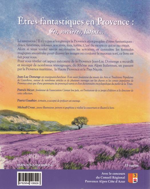 4e page de couverture : Le savez-vous ? Il n’y a pas si longtemps la Provence était peuplée d’êtres fantastiques : dracs, fantômes, colosses, sorcières, fées, lutins. C’est du moins ce qui se racontait. Alors si vous voulez savoir reconnaitre les sorcières, et connaître les formules magiques ancestrales pour chasser les nuages ou conjurer le mauvais sort, ce livre est fait pour vous. Pour vous révéler cet aspect méconnu de la Provence Jean-Luc Domenge a recueilli et recoupé de nombreux témoignages, du Rhône aux Alpes Italiennes, en passant par la Provence maritime, la Haute Provence et le Pays Niçois.