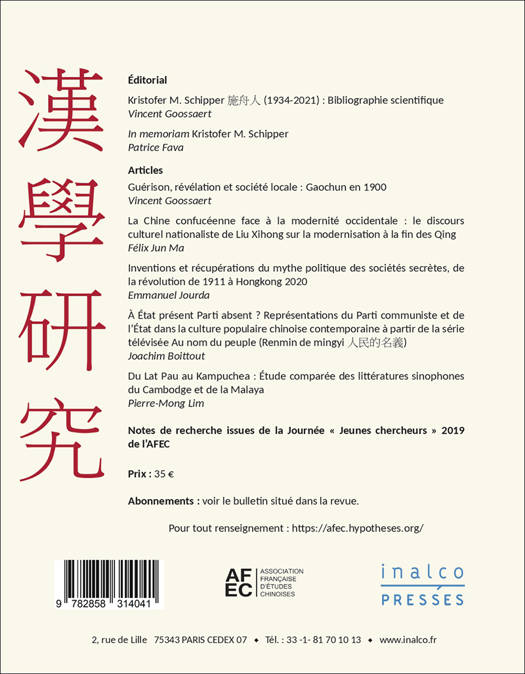 Ce numéro affiche une unité chronologique certaine en couvrant une période qui va des dernières décennies de l’empire jusqu’au début du xxie siècle. L’analyse une longue monographie produite par Le Temple du secours universel, l’héritage intellectuel de l’un des premiers diplomates chinois à avoir séjourné en Occident, l’appropriation de la tradition des « triades » par les mouvements révolutionnaires, l’étude d’une série TV consacrée à la lutte contre la corruption en Chine ou encore l’histoire d’un journal sino-khmer fondé en 1881 sont autant de sujets passionnants que les différents auteurs se proposent d'étudier dans ces pages. Dans la tradition de sinologie généraliste de la revue, ces articles sont suivis de notes de recherche qui embrassent une tranche temporelle beaucoup plus étendue.