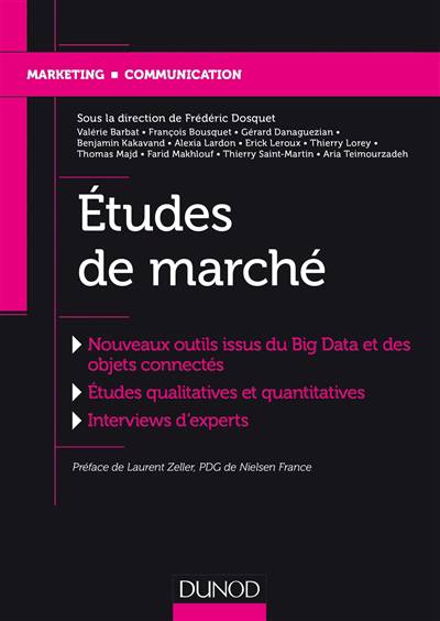 Internet, le Big Data et les objets connectés ont révolutionné la collecte et la gestion des données. Les marchés sont de plus en plus mouvants et les études de marché restent primordiales dans la définition et la conduite des stratégies marketing. Cet ouvrage est l’un des premiers à intégrer cette nouvelle donne. Les auteurs, enseignants et professionnels, ont ainsi mis l’accent sur les nouveaux outils et protocoles proposés par l’introduction des nouvelles technologies dans l’industrie des études de marché. Illustré de nombreux exemples, ce livre a pour objectif de présenter les missions et les outils permettant la réalisation des études de marché. Il sera un précieux guide pour toutes celles et ceux qui les utilisent dans un contexte universitaire ou professionnel.