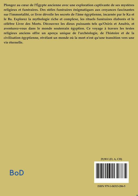 Plongez au coeur de l'Égypte ancienne avec une exploration captivante de ses mystères religieux et funéraires. Des stèles funéraires énigmatiques aux croyances fascinantes sur l'immortalité, ce livre dévoile les secrets de l'âme égyptienne, incarnée par le Ka et le Ba. Explorez la mythologie riche et complexe, les rituels funéraires élaborés et le célèbre Livre des Morts. Découvrez les dieux puissants tels qu'Osiris et Anubis, et aventurez-vous dans le monde souterrain égyptien. Ce voyage à travers les textes religieux anciens offre un aperçu unique de l'archéologie, de l'histoire et de la civilisation égyptienne, révélant un monde où la mort n'est qu'une transition vers une vie éternelle.