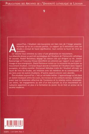 Etre étudiant aujourd'hui, c'est un véritable métier. L'apprentissage se fait dans un slalom incessant entre les cours, les travaux et les contacts sociaux. Comptent avant tout la dimension affective de l'existence et la relation entre camarades. Les loisirs, les engagements au sein d'un kot-à-projet ou d'un mouvement estudiantin apportent un plus à la formation du jeune: ils en font un acteur de la société moderne.