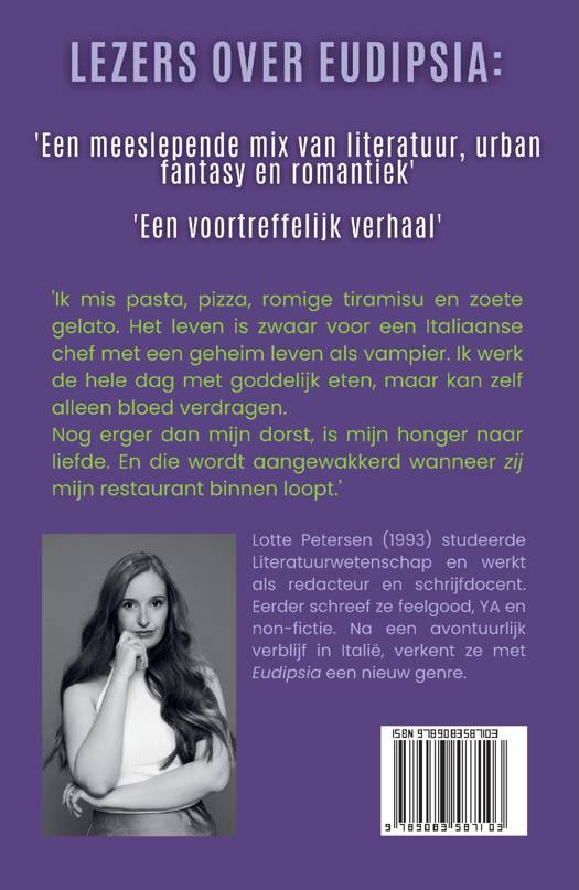 'Ik mis pasta, pizza, romige tiramisu en zoete gelato. Het leven is zwaar voor een Italiaanse chef met een geheim leven als vampier. Ik werk de hele dag met goddelijk eten, maar kan zelf alleen bloed verdragen. Nog erger dan mijn dorst, is mijn honger naar liefde. En die wordt aangewakkerd wanneer zij mijn restaurant binnen loopt.'
