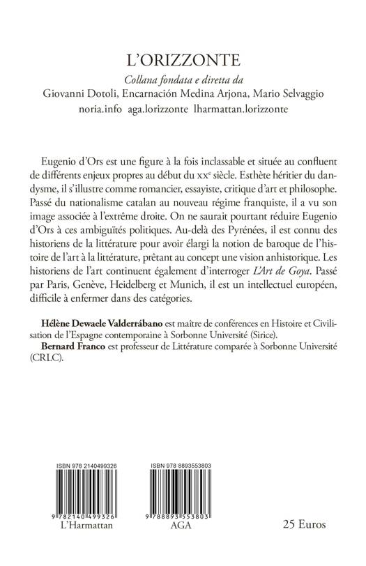 Eugenio d’Ors est une figure à la fois inclassable et située au confluent de différents enjeux propres au début du XXe siècle. Esthète héritier du dandysme, il s’illustre comme romancier, essayiste, critique d’art et philosophe. Passé du nationalisme catalan au nouveau régime franquiste, il a vu son image associée à l’extrême droite. On ne saurait pourtant réduire Eugenio d’Ors à ces ambiguïtés politiques. Au-delà des Pyrénées, il est connu des historiens de la littérature pour avoir élargi la notion de baroque de l’histoire de l’art à la littérature, prêtant au concept une vision anhistorique. Les historiens de l’art continuent également d’interroger L’Art de Goya. Passé par Paris, Genève, Heidelberg et Munich, il est un intellectuel européen, difficile à enfermer dans des catégories.