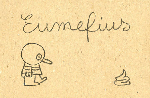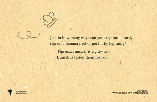 Het zijn er tachtig, liefst in een combinatie. Eumefius, een antiheld, ondergaat het allemaal zonder woorden.