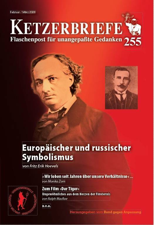 Europäischer und russischer Symbolismusvon Fritz Erik Hoevels»Evolution vor eigenen Augen« - die Sensationspinguine,oder: Darwin für Dummevon Beate Skalée»Wir leben seit Jahren über unsere Verhältnisse«...von Monika ZornTrumps zweiter imperialistischer Sündenfall -doch die eigentlichen Kriegstreiber dürfennach wie vor nicht aus dem Blick geraten!Ist die Islamhätschelung jetzt zu Ende?Merz provoziert die atomare Auslöschung DeutschlandsDie totale Gleichschaltung des Internets durch den Digital Services Act (DSA)von Ursula LeitnerAcht Fragen an den JugendoffizierSchüler, Lehrlinge, Studenten - aufgepaßt!Zum Film »Der Tiger« Ungewöhnliches aus dem Herzen der Finsternisvon Ralph MacRaeDas ewig zynische zweierlei MaßDas »Aus des Verbrenner-Aus«? Von wegen!von Joachim FüseterWie man durch Schaden nicht klug wirdRezension: Salman RushdieKNIFE. Gedanken nach einem Mordversuchvon Peter PriskilKurz und zynisch