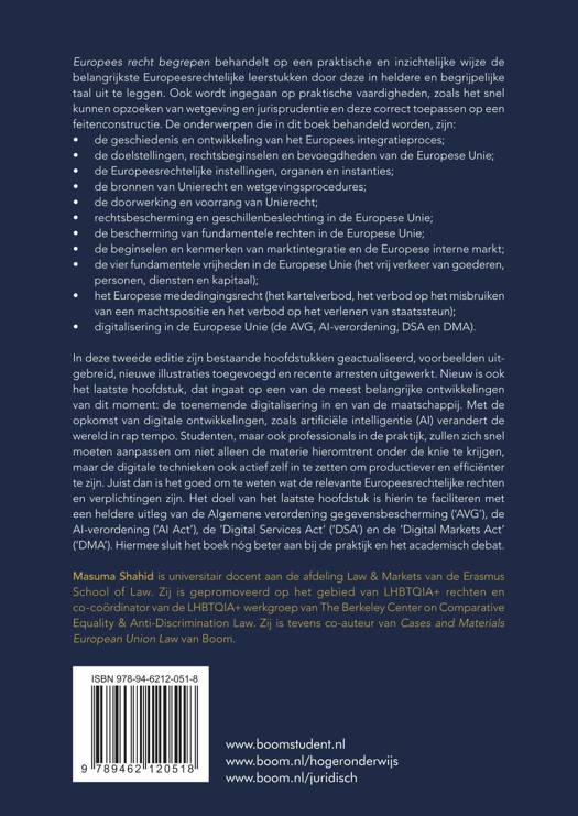 Europees recht begrepen behandelt op een praktische en inzichtelijke wijze de belangrijkste Europeesrechtelijke leerstukken door deze in heldere en begrijpelijke taal uit te leggen. Ook wordt ingegaan op praktische vaardigheden, zoals het snel kunnen opzoeken van wetgeving en jurisprudentie en deze correct toepassen op een feitenconstructie. De onderwerpen die in dit boek behandeld worden, zijn: • de geschiedenis en ontwikkeling van het Europees integratieproces; • de doelstellingen, rechtsbeginselen en bevoegdheden van de Europese Unie; • de Europeesrechtelijke instellingen, organen en instanties; • de bronnen van Unierecht en wetgevingsprocedures; • de doorwerking en voorrang van Unierecht; • rechtsbescherming en geschillenbeslechting in de Europese Unie; • de bescherming van fundamentele rechten in de Europese Unie; • de beginselen en kenmerken van marktintegratie en de Europese interne markt; • de vier fundamentele vrijheden in de Europese Unie (het vrij verkeer van goederen, personen, diensten en kapitaal); • het Europese mededingingsrecht (het kartelverbod, het verbod op het misbruiken van een machtspositie en het verbod op het verlenen van staatssteun); • digitalisering in de Europese Unie (de AVG, AI-verordening, DSA en DMA). In deze tweede editie zijn bestaande hoofdstukken geactualiseerd, voorbeelden uitgebreid, nieuwe illustraties toegevoegd en recente arresten uitgewerkt. Nieuw is ook het laatste hoofdstuk, dat ingaat op een van de meest belangrijke ontwikkelingen van dit moment: de toenemende digitalisering in en van de maatschappij. Met de opkomst van digitale ontwikkelingen, zoals artificiële intelligentie (AI) verandert de wereld in rap tempo. Studenten, maar ook professionals in de praktijk, zullen zich snel moeten aanpassen om niet alleen de materie hieromtrent onder de knie te krijgen, maar de digitale technieken ook actief zelf in te zetten om productiever en efficiënter te zijn. Juist dan is het goed om te weten wat de relevante Europeesrechtelijke rechten en verplichtingen zijn. Het doel van het laatste hoofdstuk is hierin te faciliteren met een heldere uitleg van de Algemene verordening gegevensbescherming (‘AVG’), de AI-verordening (‘AI Act’), de ‘Digital Services Act’ (‘DSA’) en de ‘Digital Markets Act’ (‘DMA’). Hiermee sluit het boek nóg beter aan bij de praktijk en het academisch debat. Masuma Shahid is universitair docent aan de afdeling Law & Markets van de Erasmus School of Law. Zij is gepromoveerd op het gebied van LHBTQIA+ rechten en co-coördinator van de LHBTQIA+ werkgroep van The Berkeley Center on Comparative Equality & Anti-Discrimination Law. Zij is tevens co-auteur van Cases and Materials European Union Law van Boom