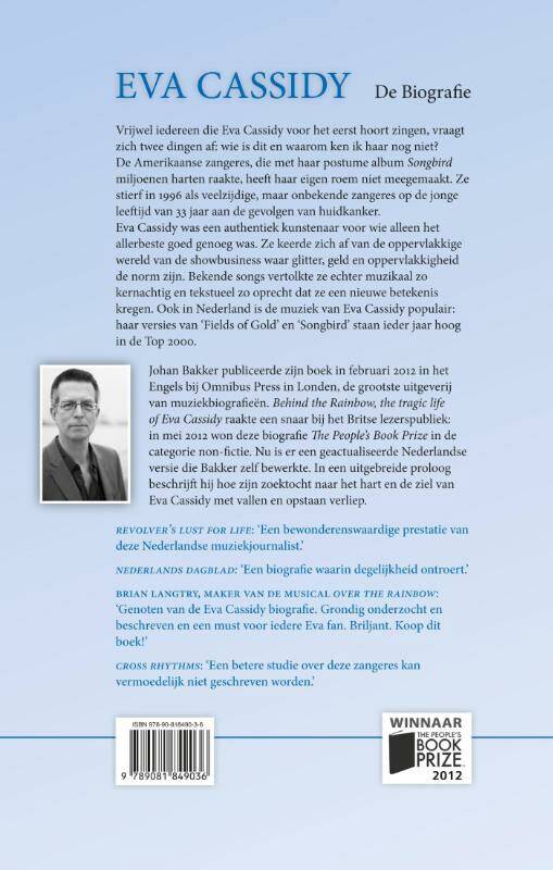 Vrijwel iedereen die Eva Cassidy voor het eerst hoort zingen, vraagt zich twee dingen af: wie is dit en waarom ken ik haar nog niet? De Amerikaanse zangeres, die met haar postume album Songbird miljoenen harten raakte, heeft haar eigen roem niet meegemaakt. Ze stierf in 1996 als veelzijdige, maar onbekende zangeres op de jonge leeftijd van 33 jaar aan de gevolgen van huidkanker. Eva Cassidy was een authentiek kunstenaar voor wie alleen het allerbeste goed genoeg was. Ze keerde zich af van de oppervlakkige wereld van de showbusiness waar glitter, geld en oppervlakkigheid de norm zijn. Bekende songs vertolkte ze echter muzikaal zo kernachtig en tekstueel zo oprecht dat ze een nieuwe betekenis kregen. Ook in Nederland is de muziek van Eva Cassidy populair: haar versies van 'Fields of Gold' en 'Songbird' staan ieder jaar hoog in de Top 2000. Johan Bakker publiceerde zijn boek in februari 2012 in het Engels bij Omnibus Press in Londen, de grootste uitgeverij van muziekbiografieën. Behind the Rainbow, the tragic life of Eva Cassidy raakte een snaar bij het Britse lezerspubliek: in mei 2012 won deze biografie The People's Book Prize in de categorie non-fictie. Nu is er een geactualiseerde Nederlandse versie die Bakker zelf bewerkte. In een uitgebreide proloog beschrijft hij hoe zijn zoektocht naar het hart en de ziel van Eva Cassidy met vallen en opstaan verliep.