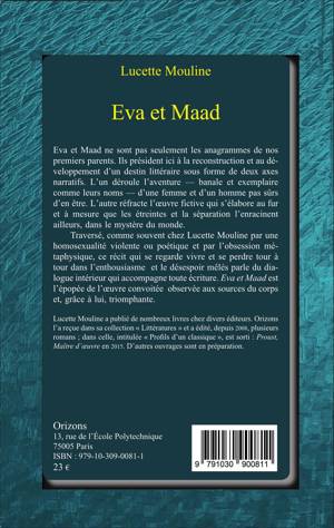Eva et Maad ne sont pas seulement les anagrammes de nos premiers parents. Ils président ici à la reconstruction et au développement d'un destin littéraire sous forme de deux axes narratifs. L'un déroule l'aventure - banale et exemplaire comme leurs noms - d'une femme et d'un homme pas sûrs d'en être. L'autre réfracte l'oeuvre fictive qui s'élabore au fur et à mesure que les étreintes et la séparation l'enracinent ailleurs, dans le mystère du monde. Ce récit qui se regarde vivre et se perdre tour à tour dans l'enthousiasme et le désespoir mêlés parle du dialogue intérieur qui accompagne toute écriture. Eva et Maad est l'épopée de l'oeuvre convoitée observée aux sources du corps et, grâce à lui, triomphante.