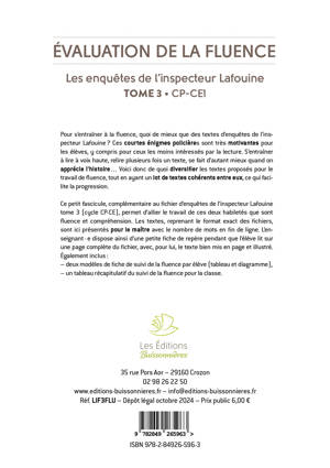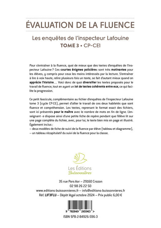 Pour s’entraîner à la fluence en lecture, quoi de mieux que des textes d’enquêtes de l’inspecteur Lafouine ? Ces énigmes policières sont très motivantes pour les élèves. De quoi diversifier les textes proposés pour le travail de fluence, tout en ayant un lot de textes cohérents entre eux, ce qui facilite la progression. Ce petit fascicule, complémentaire au fichier d’enquêtes de l’inspecteur Lafouine tome 3 (cycle 2), permet d’allier le travail de ces deux habiletés que sont fluence et compréhension. 38 textes, reprenant le format exact des fichiers, sont ici présentés pour le maître avec le nombre de mots en fin de ligne. L’enseignant·e dispose ainsi d’une petite fiche de repère pendant que l’élève lit sur une page complète du fichier (avec, pour lui, le texte bien mis en page et illustré). Également inclus : - deux modèles de fiche de suivi de la fluence par élève (tableau et diagramme), - un tableau récapitulatif du suivi de la fluence pour la classe.