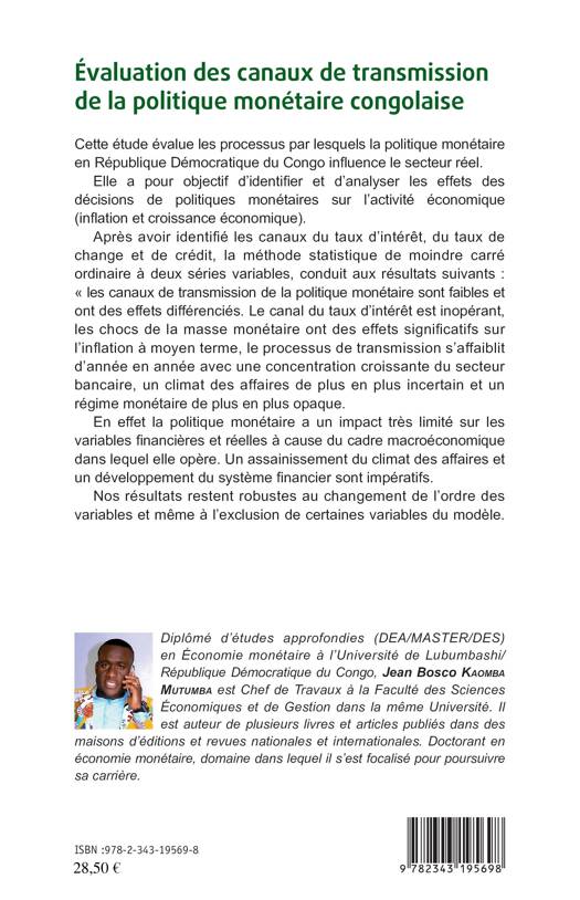 Cette étude évalue les processus par lesquels la politique monétaire en République Démocratique du Congo influence le secteur réel. Elle a pour objectif d'identifier et d'analyser les effets des décisions de politiques monétaires sur l'activité économique (inflation et croissance économique).