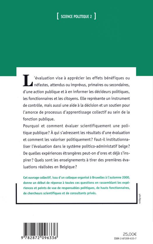 Pourquoi et comment évaluer scientifiquement une politique publique? À qui s'adressent les résultats d'une évaluation et comment les valoriser politiquement? Faut-il institutionnaliser l'évaluation dans le système politico-administratif belge? De quelles expériences étrangères peut-on s'inspirer? Quels sont les enseignements à tirer des premières évaluations réalisées en Belgique?