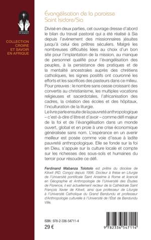 Divisé en deux parties, cet ouvrage dresse d'abord le bilan du travail pastoral qui a été réalisé à Sia depuis l'avènement des missionnaires jésuites jusqu'à celui des prêtres séculiers. Malgré les nombreuses difficultés liées au choix d'un bon site pour l'implantation de la mission, au manque de personnel qualifié pour l'évangélisation des peuples, à la persistance des pratiques et de la mentalité ancestrales auprès des chrétiens catholiques, les signes positifs ont couronné les efforts et les sacrifices des pasteurs dans ce milieu. Pour preuves le nombre sans cesse croissant des convertis au christianisme, les multiples vocations religieuses et sacerdotales, l'africanisation des cadres, la création des écoles et des hôpitaux, l'inculturation de la liturgie. Le livre parle ensuite de la pauvreté anthropologique - c'est-à-dire d'être et d'avoir - comme défi majeur de la foi et de l'évangélisation dans un monde ouvert, global et en proie à une crise économique généralisée sans nom. L'espérance en un avenir meilleur est posée comme voie d'issue à ladite pauvreté anthropologique. Elle se fonde sur la foi en Dieu, s'appuie sur la culture locale et compte sur les richesses des sous-sols et humaines du terroir pour résoudre ce défi.