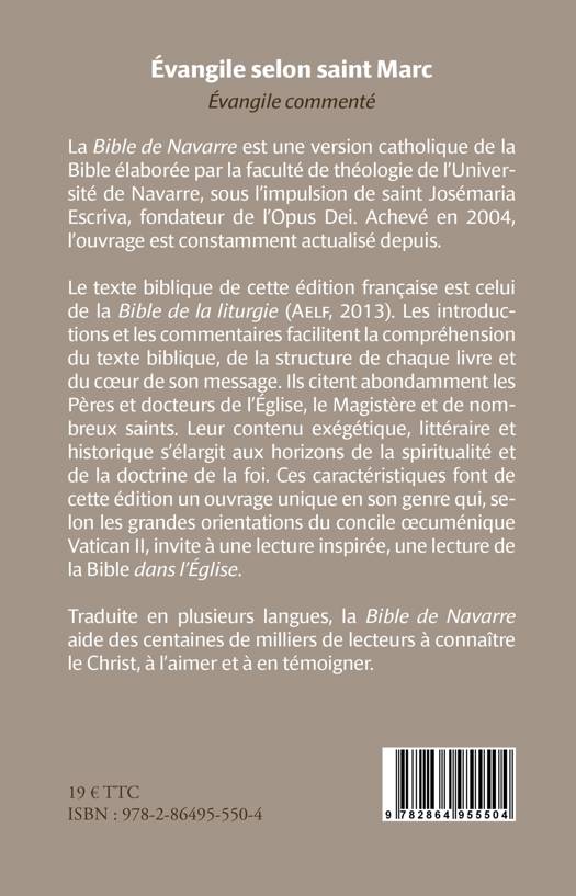 La Bible de Navarre est une version catholique de la Bible élaborée par la faculté de théologie de l'Université de Navarre, sous l'impulsion de saint Josémaria Escriva, fondateur de l'Opus Dei. Achevé en 2004, l'ouvrage est constamment actualisé depuis. Le texte biblique de cette édition française est celui de la Bible de la liturgie (Aelf, 2013). Les introductions et les commentaires facilitent la compréhension du texte biblique, de la structure de chaque livre et du coeur de son message. Ils citent abondamment les Pères et docteurs de l'Église, le Magistère et de nombreux saints. Leur contenu exégétique, littéraire et historique s'élargit aux horizons de la spiritualité et de la doctrine de la foi. Ces caractéristiques font de cette édition un ouvrage unique en son genre qui, selon les grandes orientations du concile oecuménique Vatican II, invite à une lecture inspirée, une lecture de la Bible dans l'Église. Traduite en plusieurs langues, la Bible de Navarre aide des centaines de milliers de lecteurs à connaître le Christ, à l'aimer et à en témoigner.