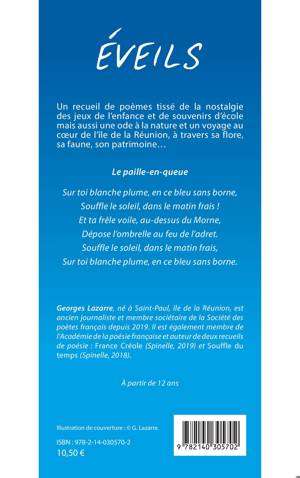 Un recueil de poèmes tissé de la nostalgie des jeux de l'enfance et de souvenirs d'école mais aussi une ode à la nature et un voyage au cur de l'île de la Réunion, à travers sa flore, sa faune, son patrimoine Le paille-en-queue Sur toi blanche plume, en ce bleu sans borne, Souffle le soleil, dans le matin frais ! Et ta frêle voile, au-dessus du Morne, Dépose l'ombrelle au feu de l'adret. Souffle le soleil, dans le matin frais, Sur toi blanche plume, en ce bleu sans borne.