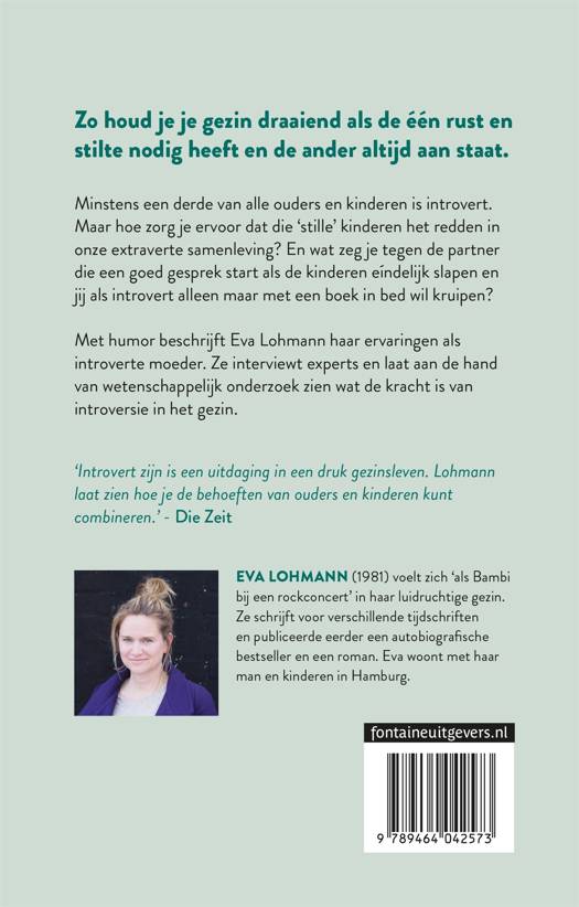 De kracht van introversie in het gezinMinstens een derde van alle mensen is introvert. Het zijn vaak diegenen die de voorkeur geven aan luisteren boven praten. Maar hoe hou je je gezin draaiend als de één rust en stilte nodig heeft en de ander altijd aan staat? Met de ervaringen en adviezen uit Even bijkomen (van mijn gezin) ontdek je oplossingen voor het drukke gezinsleven.Auteur Eva Lohmann voelt zich 'als Bambi bij een rockconcert' in haar eigen, luidruchtige gezin. In dit boek beschrijft ze haar ervaringen als moeder, interviewt experts en legt aan de hand van wetenschappelijk onderzoek uit wat de kracht is van 'stille' ouders én kinderen. Met humor en aansprekende voorbeelden laat Lohmann zien hoe je je als introverte ouder staande houdt in onze extraverte samenleving.Welk advies is er voor ouders die zich zorgen maken dat hun stille kinderen het misschien niet redden in de extraverte samenleving van vandaag? En wat zeg je de partner die wil beginnen met praten op het moment dat de kinderen eindelijk in bed liggen en jij alleen maar met een boek op de bank wilt kruipen?'Introvert zijn is een uitdaging in een druk gezinsleven. Auteur Eva Lohmann laat zien hoeje de verschillende behoeften van ouders en kinderen kunt combineren.' Die ZeitIn een lawaaierige wereld het is het voor introverte mensen niet altijd gemakkelijk om hun weg te vinden. Eva Lohmann biedt raad.' Buchreport