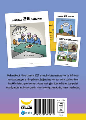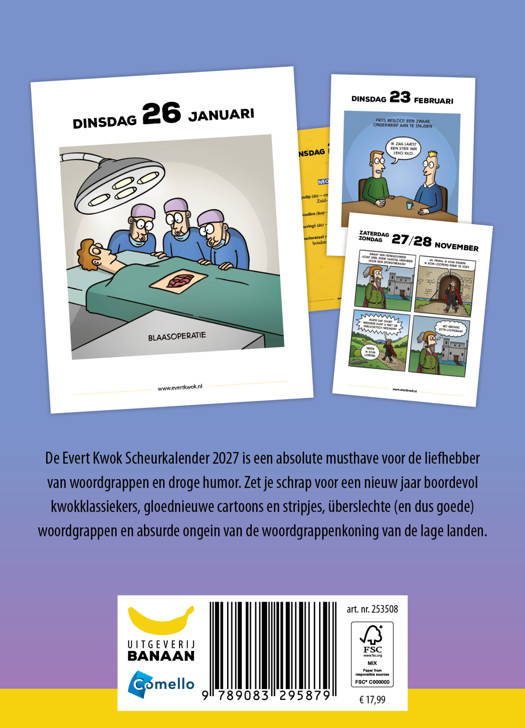 De Evert Kwok Scheurkalender 2027 is dé kalender voor liefhebbers van woordgrappen en droge humor. Zet je schrap voor een nieuw jaar boordevol kwokklassiekers, gloednieuwe cartoons en stripjes, überslechte (en dus goede) woordgrappen en absurde ongein van de woordgrappenkoning van de lage landen.
