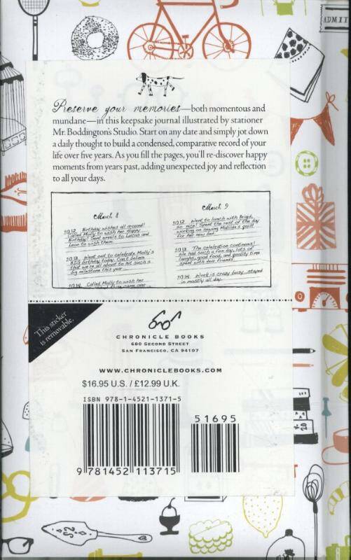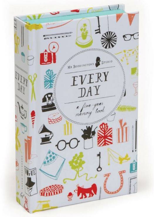 The full-colour cover of this One Line a Day from Mr. Boddington's Studio features hand-drawn illustrations of treasures from spectacles to champagne. Brightly-dyed edges, a puffy cover with rounded edges, and a ribbon marker accent the preppy and punchy look of Mr. Boddington's art and make this five-year diary a keepsake treasure.