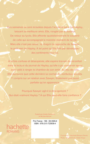 Ce que vous ignorez ne peut vous blesser.... Des mois se sont écoulés depuis l’accident qui a tué Hayley, la meilleure amie d’Ella, et l’adolescente est rongée par la culpabilité. De retour au lycée, Ella est plus que jamais confrontée aux souvenirs de sa meilleure amie – y compris à Sawyer, le petit ami d’Hayley. Le chagrin les rapproche, jusqu’à ce qu’Ella réalise quelque chose qu’elle pensait impossible.... Elle a des sentiments pour celui que sa défunte meilleure amie aimait. Confuse et désespérée, Ella plonge dans le journal intime d’Hayley, espérant y trouver quelque chose qui l’aidera à s’apaiser. Au lieu de ça, elle découvre que Sawyer a ses propres secrets et que sa relation avec Hayley n’était pas aussi parfaite qu’elle le paraissait. Ella sait qu’elle devrait tout faire pour l’éviter, mais elle se retrouve inextricablement attirée par le jeune homme - et effrayée par tout ce qu’elle n’a jamais su sur lui. Que cache-t-il ? Son comportementétrange est-il dû à son chagrin ? Ou peut-être s’agit-il d’autre chose... d’un secret tordu qu’Hayley espérait ne jamais voir déterré ?