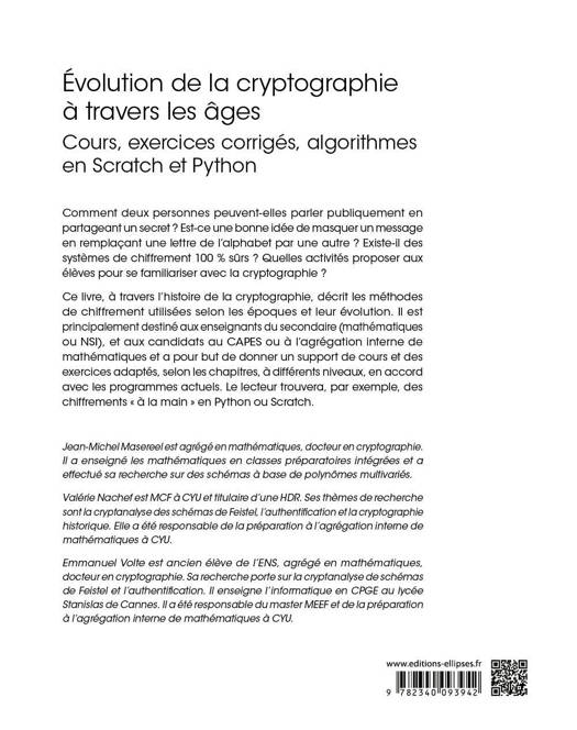 Il est principalement destiné aux enseignants du secondaire (mathématiques ou NSI), et aux candidats au CAPES ou à l’agrégation interne de mathématiques et a pour but de donner un support de cours et des exercices adaptés, selon les chapitres, à différents niveaux, en accord avec les programmes actuels. Le lecteur trouvera, par exemple, des chiffrements « à la main » en Python ou Scratch.