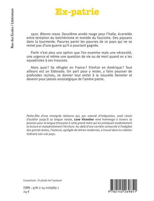 1920. Bienno rosso. Deuxième année rouge pour l'Italie, écartelée entre tentation du bolchévisme et montée du fascisme. Des paysans dans la tourmente. Pauvres parmi les pauvres de ce pays qui ne se remet pas d'une guerre qu'il a pourtant gagnée. Partir n'est plus une option que l'on examine mais une nécessité, une urgence et même une question de vie ou de mort quand on a les squadristes à ses trousses. Alors quoi ? Se réfugier en France ? S'enfuir en Amérique ? Tout ailleurs est un Eldorado. On part pour y rester, y faire pousser de profondes racines, se donner tout entier à la nouvelle Demeter et devenir pour jamais anostalgique de l'amère patrie.