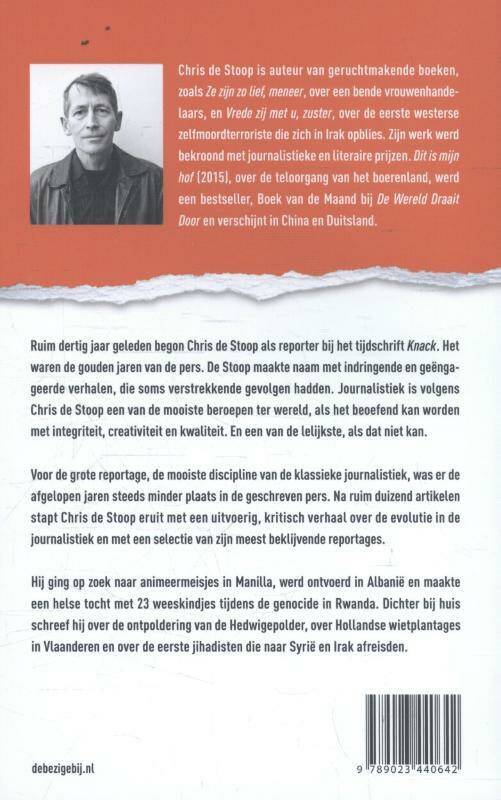 Voor de grote reportage, de mooiste discipline van de klassieke journalistiek, was er de afgelopen jaren steeds minder plaats in de geschreven pers. Na ruim duizend artikelen stapt Chris de Stoop eruit met een uitvoerig, kritisch verhaal over de evolutie in de journalistiek en met een selectie van zijn meest beklijvende reportages.