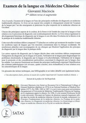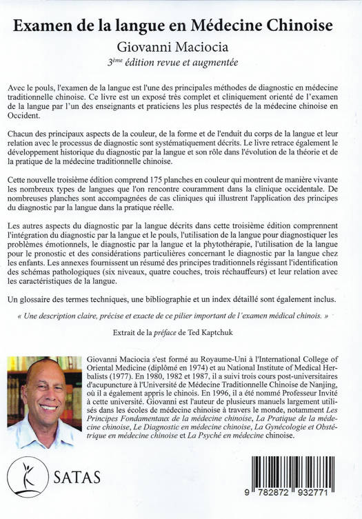 Avec le pouls, l'examen de la langue est l'une des principales méthodes de diagnostic en médecine traditionnelle chinoise. Ce livre est un exposé très complet et cliniquement orienté de l'examen de la langue par l'un des enseignants et praticiens les plus respectés de la médecine chinoise en Occident. Chacun des principaux aspects de la couleur, de la forme et de l'enduit du corps de la langue et leur relation avec le processus de diagnostic sont systématiquement décrits. Le livre retrace également le développement historique du diagnostic parla langue et son rôle dans l'évolution de la théorie et de la pratique de la médecine traditionnelle chinoise. Cette nouvelle troisième édition comprend 175 planches en couleur qui montrent de manière vivante les nombreux types de langues que l'on rencontre couramment dans la clinique occidentale. De nombreuses planches sont accompagnées de cas cliniques qui illustrent l'application des principes du diagnostic par la langue dans la portique réelle. Les autres aspects du diagnostic par la langue décrits dans cette troisième édition comprennent l'intégration du diagnostic parla langue et le pouls, l'utilisation de la langue pour diagnostiquer les problèmes émotionnels, le diagnostic par la langue et la phytothérapie, l'utilisation de la langue pour le pronostic et des considérations particulières concernant le diagnostic par la langue chez les enfants. Les annexes fournissent un résumé des principes traditionnels régissant l'identification des schémas pathologiques (six niveaux, quatre couches, trois réchauffeurs) et leur relation avec les caractéristiques de la langue. Un glossaire des termes techniques, une bibliographie et un index détaillé sont également inclus.