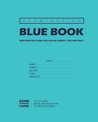 Beautifully crafted exam blue book for use in schools, collages and universities with standard wide-ruled lines and various blue-color tones to choose from. Soft thick pages give it a wonderful feel and pleasure to write-in with durable perfect bound soft cover to last harsh opening and closing, hand-to-hand handling of examiners. What to love: * 12 Sheets (24 Pages). * 8" x 10" Sized Exam Standard Booklet. * Wide-ruled, 8.7mm Blank Lines. * White Uncoated, Acid-free, 75 gsm Paper. * Perfect bound, permanent soft cover. Remember exams can be testing, whether you think you can or cannot you are right.