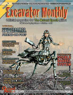 Welcome adventurer! This is the first issue of Outland Arts' entirely The Mutant Epoch focused magazine, Excavator Monthly. Included in this inaugural issue are articles on GM rewarded Experience Factors, another on how to handle multiple player characters, a character generation technique: the Double Barrel System, a word on some gaming blogs and podcasts, new relics: liquid flesh and the net gun, 2 NPCs and 3 mutant creatures: the creeping digester, jaw hog, and howling eviscerator. There is also a short story entitled Demon in the Depths, a write up on The Mutant Epoch website, preview of Pitford: Gateway to the Ruins, and a treasure table. Finally, an extensive article on Spiderborgs as NPCs, hostile foes, or player characters. Excavator Monthly is the official magazine for The Mutant Epoch milieu, covering the TME RPG, fiction, art and more. Not using the Outland System? No worries, there is a ton here that any post apocalyptic GM can utilize. 19 illustrations 40 pages