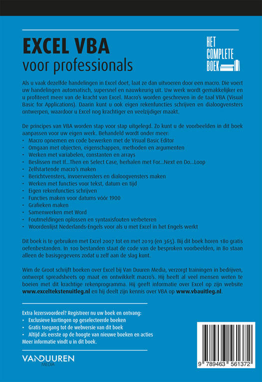 VBA is de programmeertaal waarin macro's worden geschreven. Als u macro's aan Excel toevoegt, maakt u het werk gemakkelijker en gebruikt u veel meer mogelijkheden van Excel. Met VBA (Visual Basic for Applications) kunt u vaak voorkomende handelingen automatiseren en dus sneller uitvoeren. Ook kunt u daarmee eigen rekenfuncties schrijven en dialoogvensters ontwerpen, waardoor u Excel nog krachtiger en veelzijdiger maakt. De principes van het programmeren worden stap voor stap uitgelegd, zodat u niet alleen leert wat u moet doen, maar vooral waarom het zo werkt. Zo kunt u de 450 voorbeelden van macro's en 40 zelfgeschreven functies in dit boek eenvoudig aan- passen voor uw eigen werk.