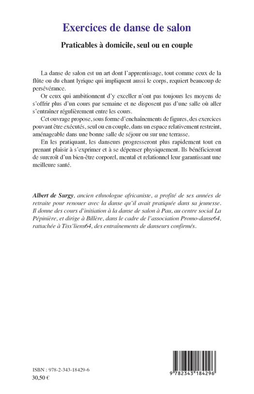 La danse de salon est un art dont l'apprentissage, tout comme ceux de la flûte ou du chant lyrique qui impliquent aussi le corps, requiert beaucoup de persévérance. Or ceux qui ambitionnent d'y exceller n'ont pas toujours les moyens de s'offrir plus d'un cours par semaine et ne disposent pas d'une salle où aller s'entraîner régulièrement entre les cours. Cet ouvrage propose, sous forme d'enchaînements de figures, des exercices pouvant être exécutés, seul ou en couple, dans un espace relativement restreint, aménageable dans une bonne salle de séjour ou sur une terrasse. En les pratiquant, les danseurs progresseront plus rapidement tout en prenant plaisir à s'exprimer et à se dépenser physiquement. Ils bénéficieront de surcroît d'un bien-être corporel, mental et relationnel leur garantissant une meilleure santé.