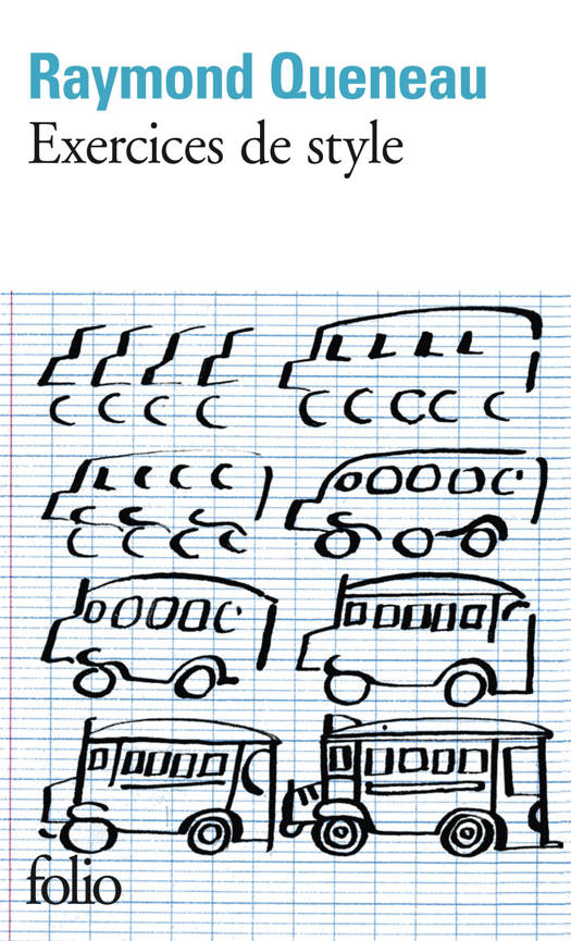 Le narrateur rencontre, dans un autobus, un jeune homme au cou long, coiffé d'un chapeau orné d'une tresse au lieu de ruban. Le jeune voyageur échange quelques mots assez vifs avec un autre voyageur, puis va s'asseoir à une place devenue libre. Un peu plus tard, le narrateur rencontre le même jeune homme en grande conversation avec un ami qui lui conseille de faire remonter le bouton supérieur de son pardessus. Cette brève histoire est racontée quatre-vingt-dix-neuf fois, de quatre-vingt-dix-neuf manières différentes. Mise en images, portée sur la scène des cabarets, elle a connu une fortune extraordinaire. Exercices de style est un des livres les plus populaires de Queneau.