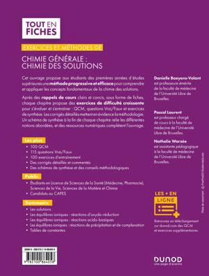 Cet ouvrage propose aux étudiants des premières années d'études supérieures une méthode progressive et efficace pour comprendre et appliquer les concepts fondamentaux de la chimie des solutions. Après des rappels de cours clairs et concis, sous forme de fiches, chaque chapitre propose des exercices de difficulté croissante pour s'évaluer et s'entrainer : QCM, questions Vrai/Faux et exercices de synthèse. Tous sont corrigés : questions Vrai/Faux et exercices de synthèse bénéficient d'une réponse détaillée mettant en évidence la méthodologie. Un schéma de synthèseà la fin de chaque chapitre relie les différentes notions abordées.