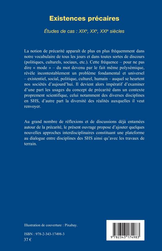 La notion de précarité apparaît de plus en plus dans notre vocabulaire de tous les jours et dans toutes sortes de discours (politiques, culturels, sociaux, etc.). Cette fréquence du mot devenu par le fait même polysémique révèle incontestablement un problème fondamental et universel auquel se heurtent nos sociétés d'aujourd'hui. Il devient alors impératif d'examiner d'une part les usages du concept de précarité dans un contexte scientifique, celui notamment des diverses disciplines en SHS, d'autre part la diversité des réalités auxquelles il veut renvoyer. Au grand nombre de réflexions et de discussions déjà entamées autour de la précarité, cet ouvrage propose d'ajouter de nouvelles approches interdisciplinaires constituant une plateforme au dialogue entre disciplines ainsi qu'avec les travaux de terrain.