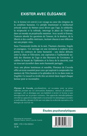 Ici, le lecteur est convié à un voyage au coeur des énigmes de la condition humaine. Ce périple émotionnel et intellectuel articulé autour de thèmes aussi divers que l'ego, la solidarité, la réciprocité et la solitude, interroge la place de l'individu dans un monde en perpétuelle mutation. Avec acuité et finesse, l'auteure aborde les questions de l'amour, de la douleur, de la liberté et des conflits intérieurs, incitant chacun à une réflexion sur son propre vécu. Sous l'immensité étoilée de la nuit, l'humain chemine, fragile et courageux. Cet ouvrage est une invitation à explorer avec poésie les contours de notre humanité une danse délicate entre la chute et l'élévation, une aspiration à l'authenticité au-delà des illusions de l'ego et des blessures de l'existence. Il célèbre la beauté de l'éphémère et la force de la sincérité, tout en trouvant réconfort dans notre humanité partagée. Avec une plume lumineuse et sensible, Florence de Coccola offre un texte essentiel pour ceux qui aspirent à comprendre les nuances de l'être humain et la splendeur de la vie dans toute sa fragilité. Ce recueil se révèle être un miroir dans lequel chaque lecteur peut se reconnaître.