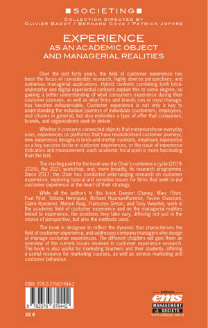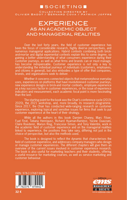 The book is designed to reflect the dynamic that characterises the field of customer experience, and addresses company managers who design or manage customer experiences. The different chapters will give them an overview of the current issues involved in customer experience research. The book is also useful for marketing teachers and their students, offering a useful resource for marketing courses, as well as service marketing and customer behaviour.