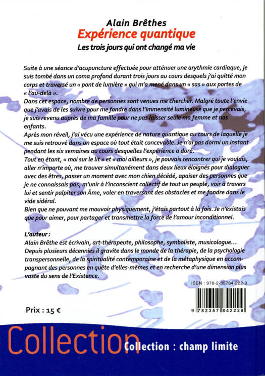 Suite à une séance d'acupuncture, je suis tombé dans un coma profond durant trois jours au cours desquels j'ai quitté mon corps et traversé un « pont de lumière » qui m'a mené dans un « sas » aux portes de « l'au-delà ». Dans cet espace, nombre de personnes sont venues me chercher. Malgré toute l'envie que j'avais de les suivre, je suis revenu auprès de ma famille. Après mon réveil, j'ai vécu une expérience de nature quantique au cours de laquelle je me suis retrouvé dans un espace où tout était concevable. Je n'ai pas dormi un instant pendant les six semaines au cours desquelles l'expérience a duré. Tout en étant, « 'moi sur le lit »' et « 'moi ailleurs »', je pouvais rencontrer qui je voulais, aller n'importe où, me trouver simultanément dans deux lieux éloignés pour dialoguer avec des êtres, apaiser des inconnus, m'unir à l'inconscient collectif de tout un peuple, voler en traversant des obstacles et me fondre dans le vide sidéral. Bien que ne pouvant me mouvoir physiquement, j'étais partout à la fois. Je n'existais que pour aimer et transmettre la force de l'amour inconditionnel.