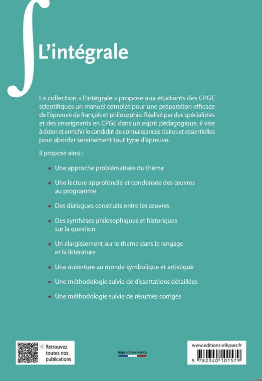 La collection « L’Intégrale » propose aux étudiants des CPGE scientifiques un manuel complet pour une préparation efficace de l’épreuve de français et philosophie. Réalisé par des spécialistes et des enseignants en CPGE dans un esprit pédagogique, il vise à doter et enrichir le candidat de connaissances claires et essentielles pour aborder sereinement tout type d’épreuve.