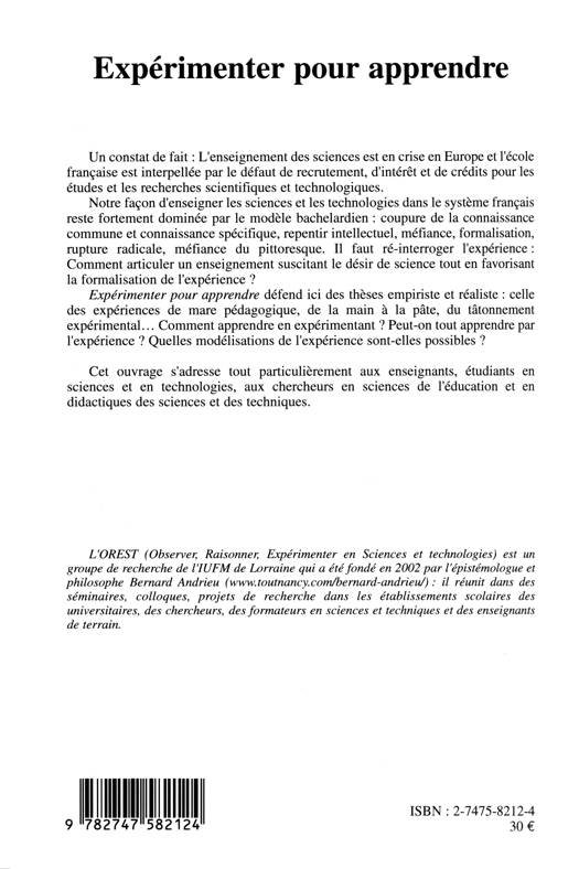 L'enseignement des sciences est en crise en Europe et l'école française est interpellée par le défaut de recrutement, d'internet, de crédits pour les études et les recherches scientifiques et technologiques. Il apparaît nécessaire de re-interroger l'expérience : comment articuler un enseignement suscitant le désir de sciences tout en favorisant la formalisation de l'expérience ? Cette étude défend des thèses empiristes et réalistes : comment apprendre en expérimentant, peut-on tout apprendre par l'expérience ?