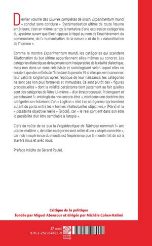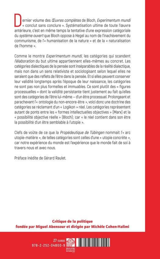 Dernier volume des OEuvres complètes de Bloch, Experimentum mundi « conclut sans conclure ». Systématisation ultime de toute l’oeuvre antérieure, c’est en même temps la tentative d’une expression catégoriale du système ouvert que Bloch oppose à Hegel au nom de l’inachèvement du communisme, de l’« humanisation de la nature » et de la « naturalisation de l’homme ».
