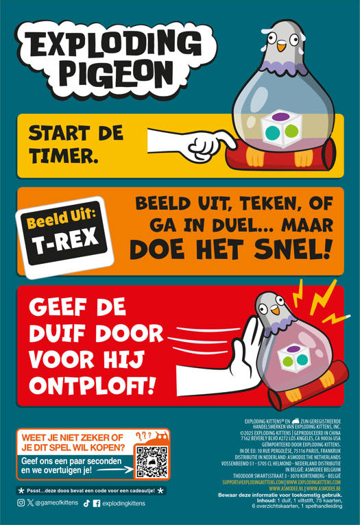 Exploding Pigeon: Een familiespel waarbij je snel moet raden om de duif door te geven voordat hij ontploft! In dit hectische spel, waarbij elke seconde telt, laat je je team een ??woord raden door te spreken, te mimen of een kleine uitdaging aan te gaan, en geef je de duif door voordat hij ontploft! Maar pas op: als je team er te lang over doet, vliegt de duif eraf en verlies je de ronde. Snel, lawaaierig en compleet gek, het perfecte spel voor een avond vol hilariteit.