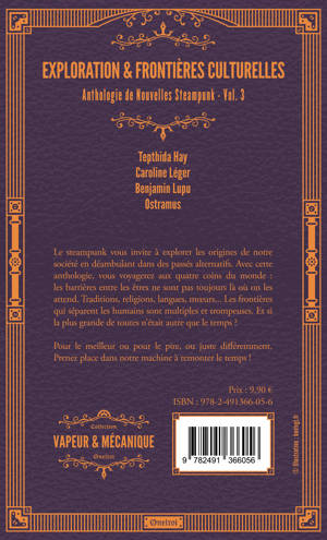 Quatrième de couverture « Le steampunk vous invite à explorer les origines de notre société en déambulant dans des passés alternatifs. Avec cette anthologie, vous voyagerez aux quatre coins du monde : les barrières entre les êtres ne sont pas toujours là où on les attend. Traditions, religions, langage, mœurs… Les frontières qui séparent les humains sont multiples et trompeuses. Et si la plus grande de toutes n’était autre que le temps ? Pour le meilleur ou pour le pire, ou juste différemment. Prenez place dans notre machine à remonter le temps ! »