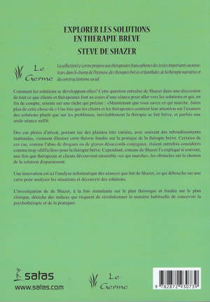 Comment les solutions se développent-elles? Cette question entraîne de Shazer dans une discussion de tout ce que clients et thérapeutes font au cours d'une séance pour aller vers les solutions et qui, en fin de compte, oriente sur une tâche qui pré "Maintenant que vous savez ce qui marche, faites plus de cette chose-là". Une fois que les clients et les thérapeutes centrent leur attention sur l'examen des solutions plutôt que sur les problèmes, inévitablement la thérapie se fait brève, et parfois une seule séance suffit. Des cas pleins d'attrait, portant sur des plaintes très variées, avec souvent des rebondissements inattendus, viennent illustrer cette théorie fondée sur la pratique de la thérapie brève. Sommaire : Se centrer sur la solution; Observation disciplinée; Comment savoir ce qu'il faut faire; Construction de théorie : vers une théorie de la solution; Construire une théorie : notes de méthodologie; Une théorie de la solution; Déconstruction : un moyen de mieux se centrer; Utilisation de la théorie; Exceptions ; la construction de solutions; Un cas inhabituel qui suit les règles; Plainte vague, objectifs vagues, solution vague; Spontanéité, imprévisibilité, solution.