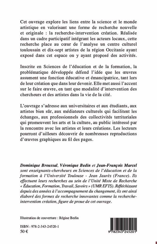 Cet ouvrage explore les liens entre la science et le monde artistique en valorisant une forme de recherche nouvelle et originale : la recherche-intervention création. Réalisée dans un cadre participatif intégrant les acteurs locaux, cette recherche place au coeur de l'analyse un centre culturel toulousain et dix-sept artistes de la région Occitanie ayant exposé dans cet espace ou y ayant proposé des activités.