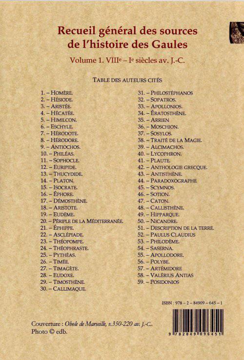 L'histoire de la Gaule à travers ses sources, reprenant des extraits de 59 auteurs grecs ou latins.