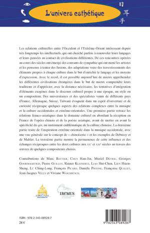 Les relations culturelles entre l'Occident et l'Extrême-Orient intéressent depuis longtemps les intellectuels, qui ont cherché parfois à renouveler leurs langages et leurs pensées au contact de civilisations différentes. Voici quelques aspects de la relation complexe entre la musique et la culture occidentales et extrême-orientales. Une première partie retrace les relations franco-asiatiques dans le domaine culturel, une deuxième traite de l'inspiration extrême-orientale dans la musique occidentale et une troisième montre la permanence de cette influence et des échanges réciproques entre les deux cultures aux XXe et XXIe siècles au travers d'œuvres de compositeurs chinois.